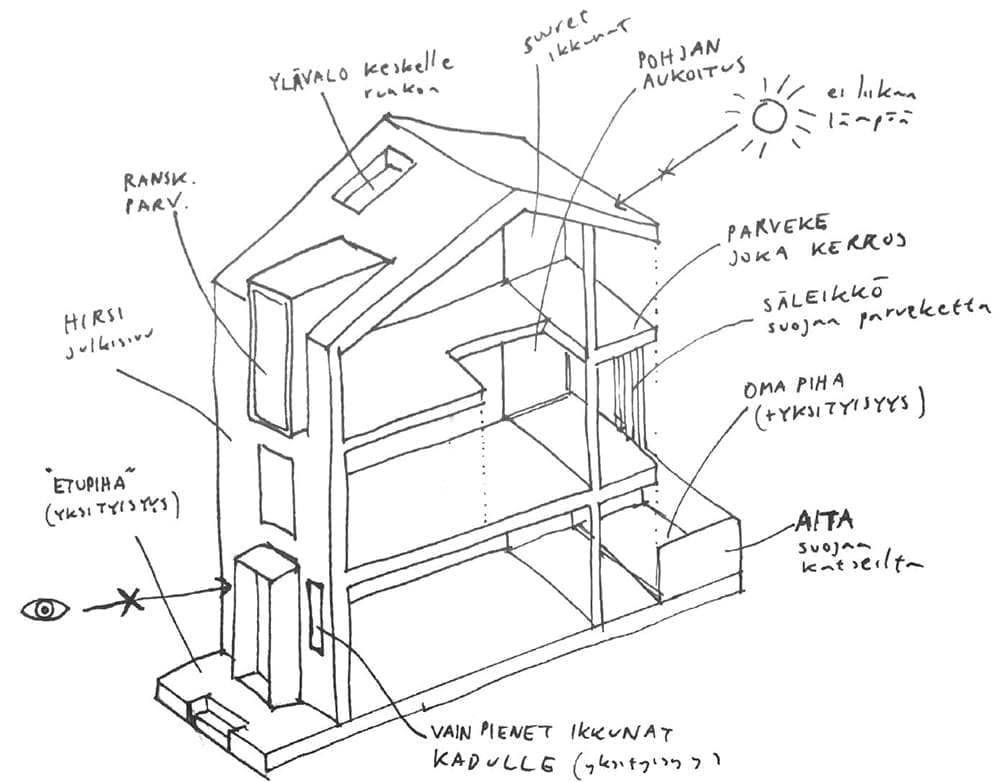 “Halusin tutkia Suomessakin suosiotaan lisäävän townhouse-talotyypin sopivuutta kaupunkiympäristöön hirsirakenteisena. Huomasin, että se pystyisi rikastuttamaan suomalaista kaupunkikuvaa ja tuoda vaihtelua kerrostaloille.”