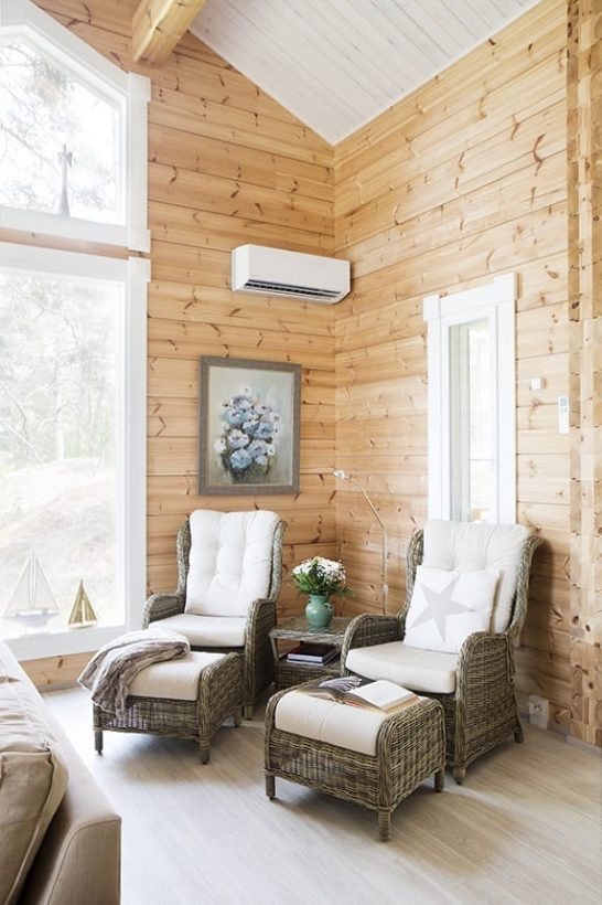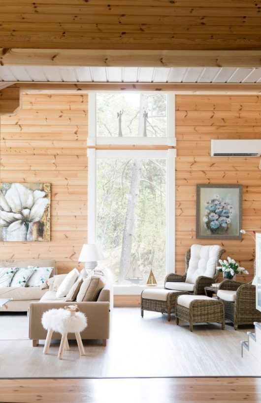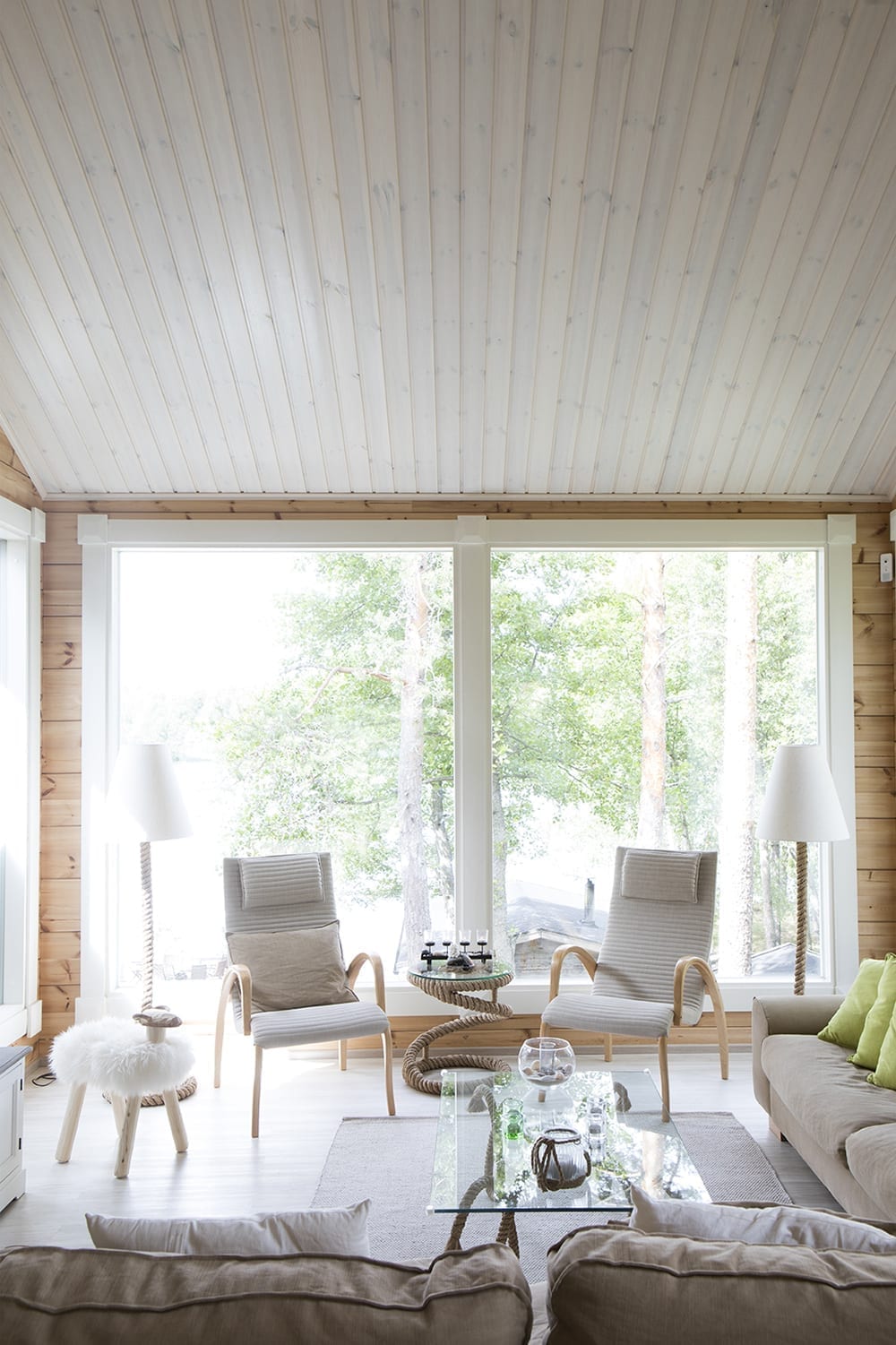 Sisustuksessa on käytetty beessin, valkoisen ja hiekan sävyjä. Kaksi katosta lattiaan ulottuvaa ikkunaa täyttää järvenpuoleisen olohuoneen seinän kokonaan.