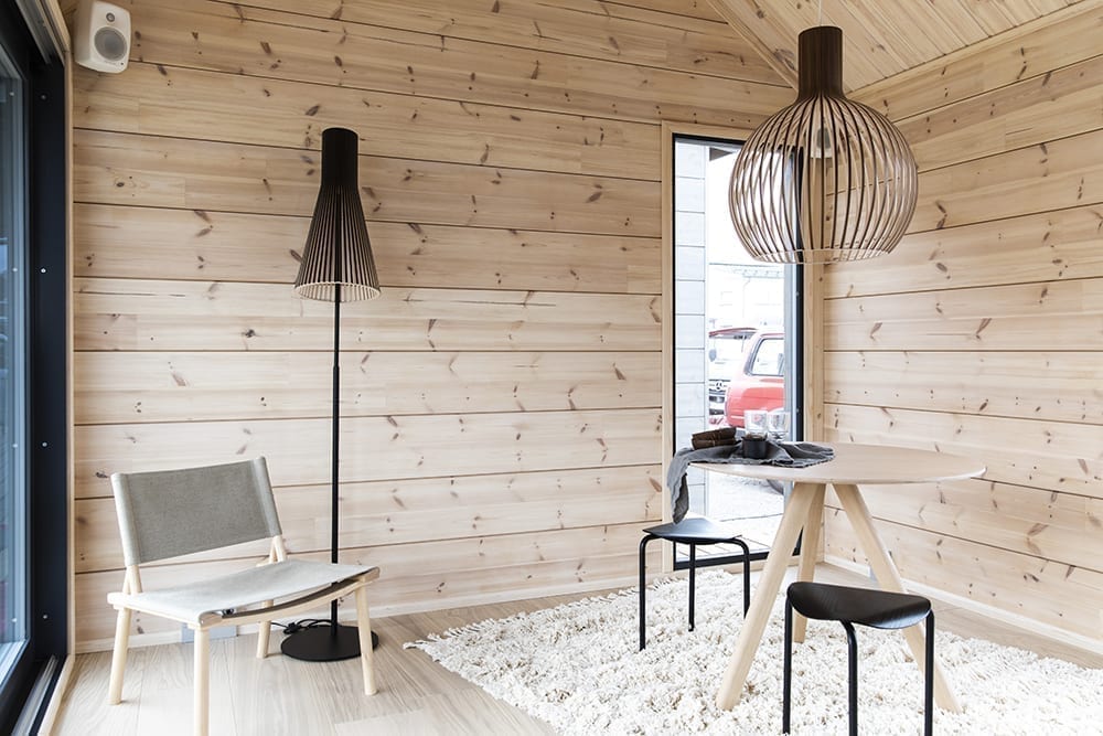 Marun vinkki #3: Lisää hirsikodin sisustukseen muutamia mustia yksityiskohtia antamaan hirrelle ryhtiä. Honka Konttiin valitsin Artekin mustat Lukki-jakkarat ja Secton 4210 jalkavalaisimen, jonka jalka on musta.