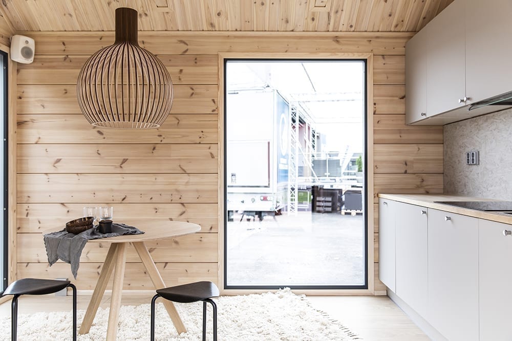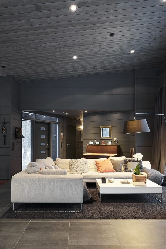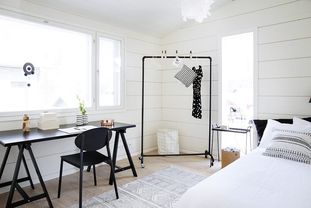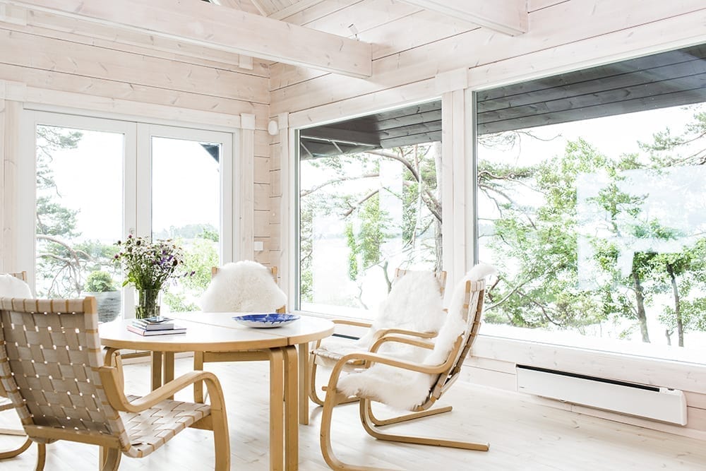 Myös ikkunoiden puitteiden ja väliovien sävyjen valinta vaikuttavat koko sisustuksen tunnelmaan. Valkoinen jättää jälleen enemmän vapautta muuhun sisustukseen, mutta Maru vinkkaa, että musta toimii erinomaisena kontrastina varsinkin kuultokäsitellylle hirrelle.