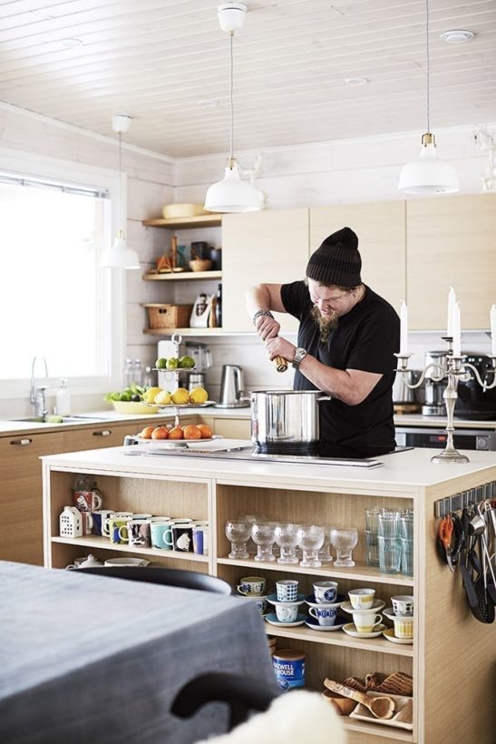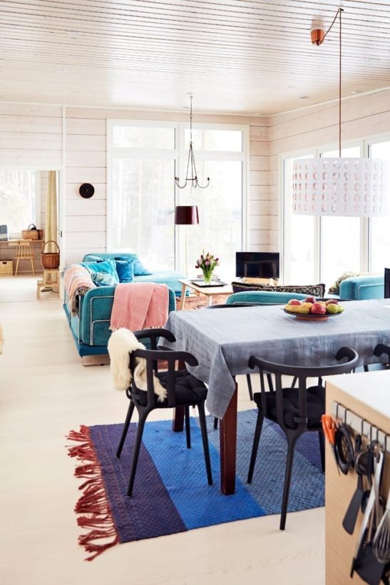 Myös varsinaisen mökin sisustuksen Haapasalot suunnittelivat itse. Pintavärit ovat vaaleita ja kevyitä, ja ne antavat tilaa värikkäille kalusteille. Vaikka Ville on aina pitänyt tummista sävyistä, tänne hän halusi vaaleutta, jotta luonto ja sen värit pääsevät esille ja näkyvät sisälle saakka. Tärkeintä oli saada koko seinän kokoiset ikkunat järvelle.