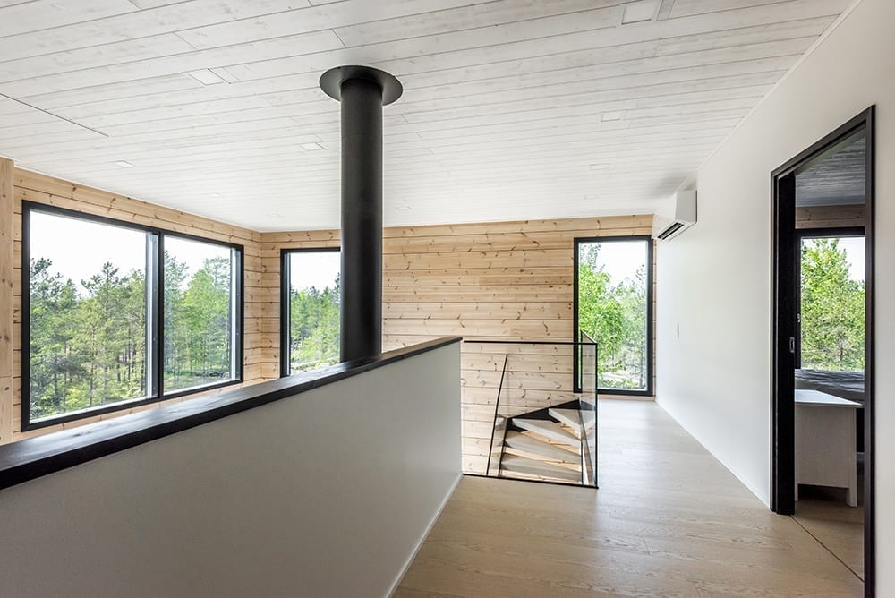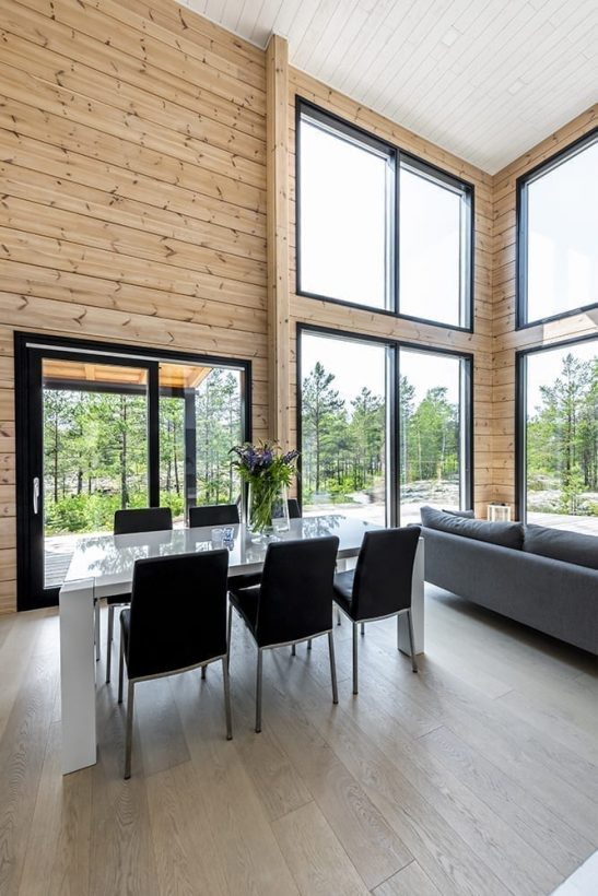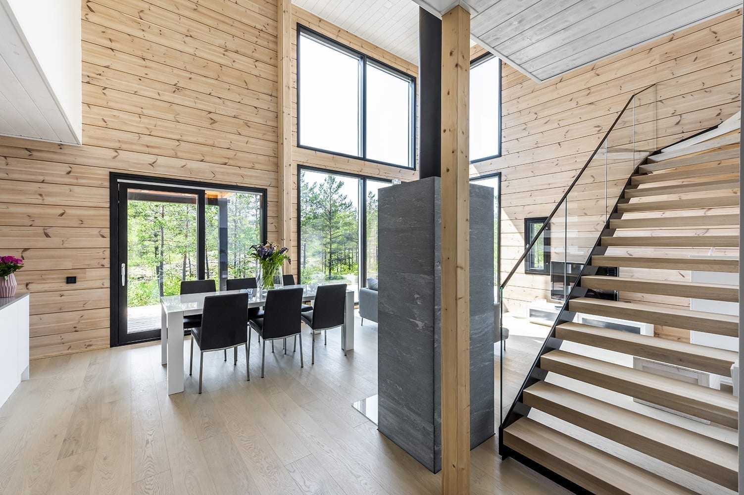 Vankat hirsiseinät, mutta moderni koti! Rakennusmateriaalina käytetty massiivipuurakenne yhdessä minimalistisen sisustustyylin kanssa antaa tilaa sille tärkeimmälle, eli ikkunoista avautuvalle karun kauniille kalliomaisemalle.