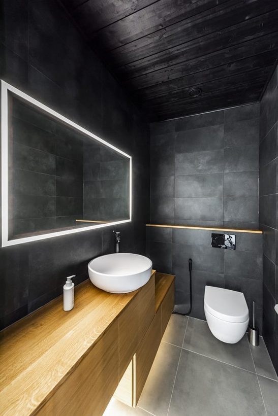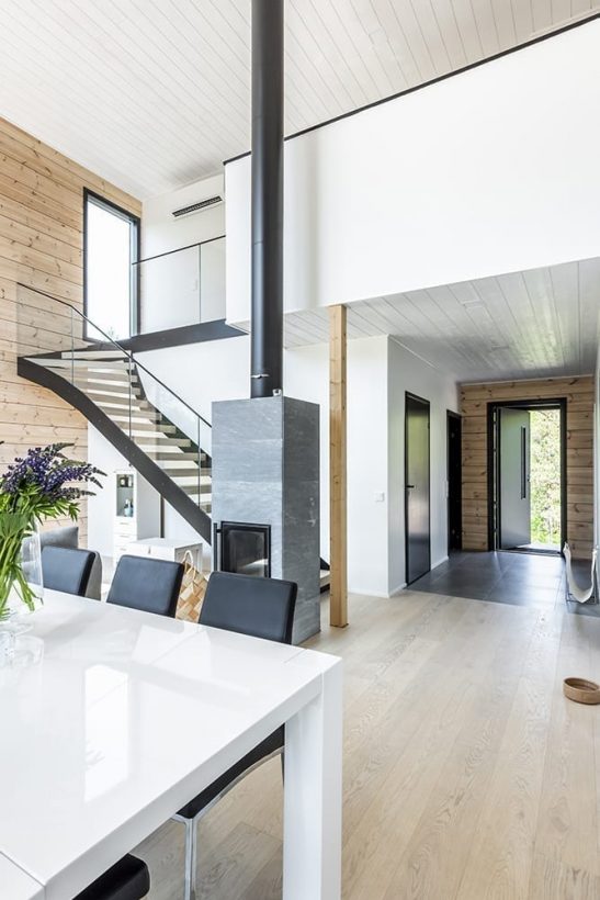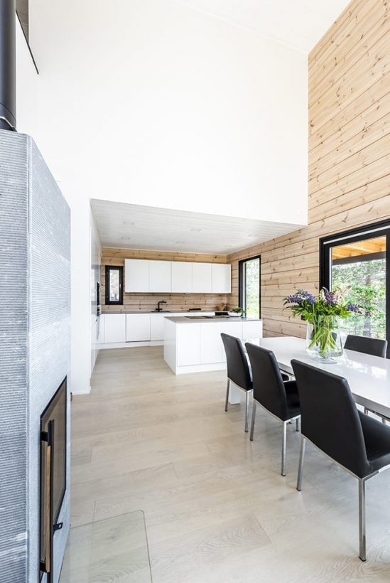 Huoneiden väliseinät ovat puolestaan levytettyjä ja maalattu valkoisiksi. Samoin kattopaneelit ovat valkoisia. Ne toimivat kauniina kontrasteina puulle ja keventävät kodin yleisilmettä.