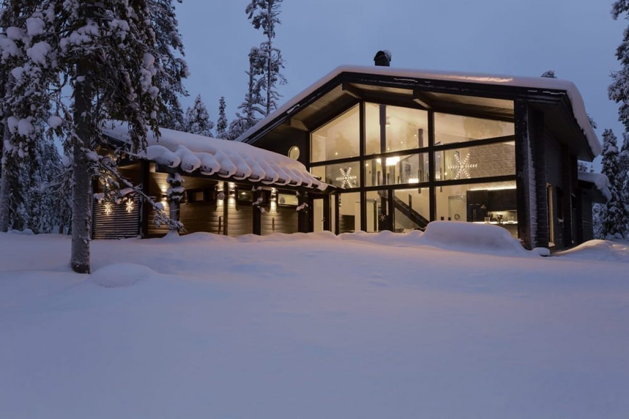 Suuret lasijulkisivut ja massiivipuinen hirsirakenne ovat näyttävä yhdistelmä.