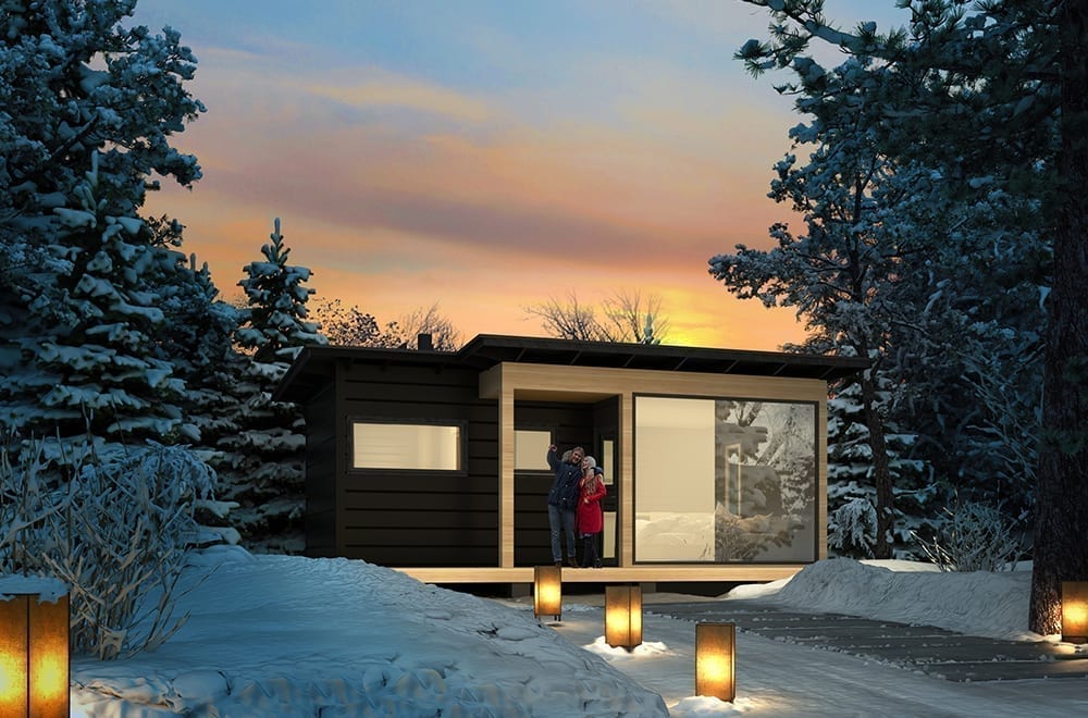 Mökkimalli Haltissa ja sen pariksi suunnitellussa Saaga-saunassa hirsi ja pilaripalkki-rakenne yhdistyvät saumattomaksi kokonaisuudeksi.