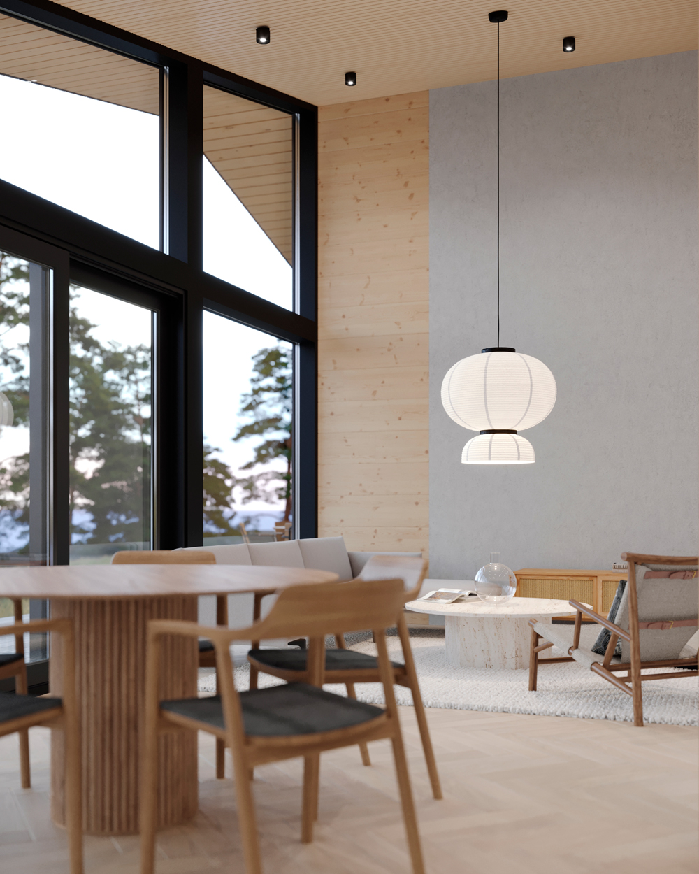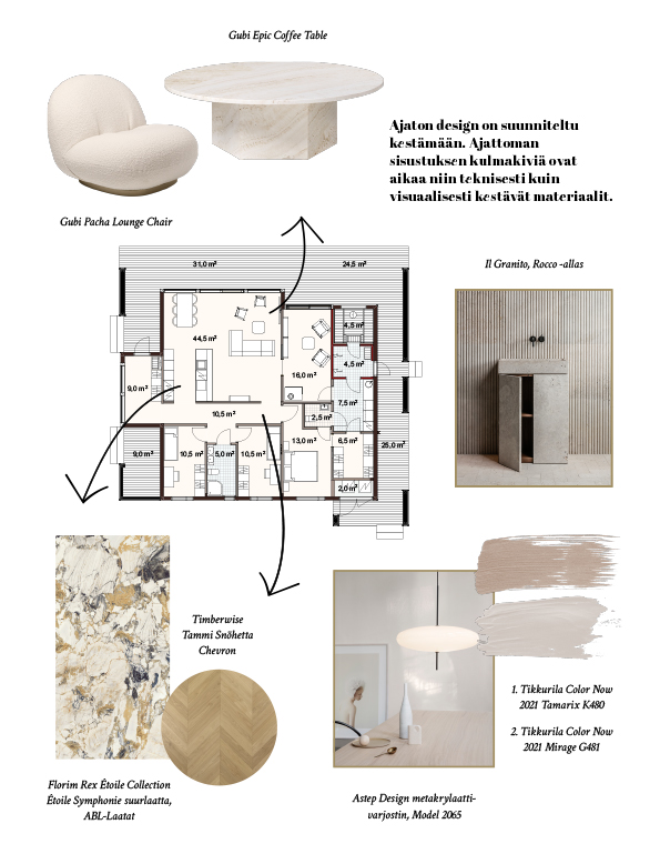 Ajattomuudessa on kyse kokonaisuudesta; siitä että rakennus, sen ympäristö ja kaikki kodin tilat pelaavat sisustuksellisesti hyvin yhteen. Se on tasapaino menneen ja tulevan välillä, molempia täytyy ymmärtää. Kun isoista ikkunapinnoista välittyvä maisema ja ympäröivä luonto ovat pääroolissa, voi sisätiloissa keskittyä pelkistämiseen. Puupintojen pariksi toisin eläväpintaista kiveä ja lämpimiä maan sävyjä. Materiaalipaletissa on sopiva määrä särmää ja yksityiskohtia. Rauhoittava värimaailma ja modernit kalusteratkaisut luovat tasapainon, jossa on tilaa myös uusille unelmille.