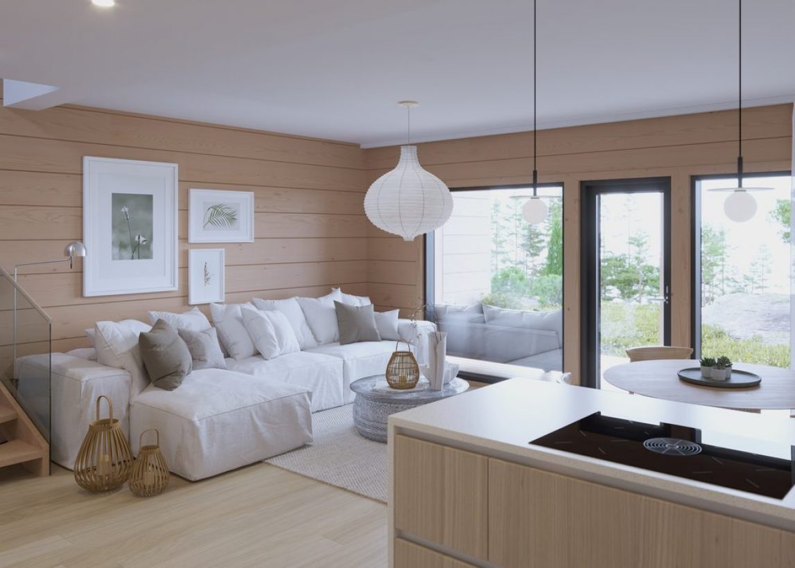 Pääkaupunkiseudulla hirsitalon voi saada myös sisältä valmiiksi, eli levypintaan asti suunnitelluksi ja rakennetuksi. Asiakkaalle jää tällöin ainoastaan mieleistensä sisustuspintojen ja kalusteiden asennus.