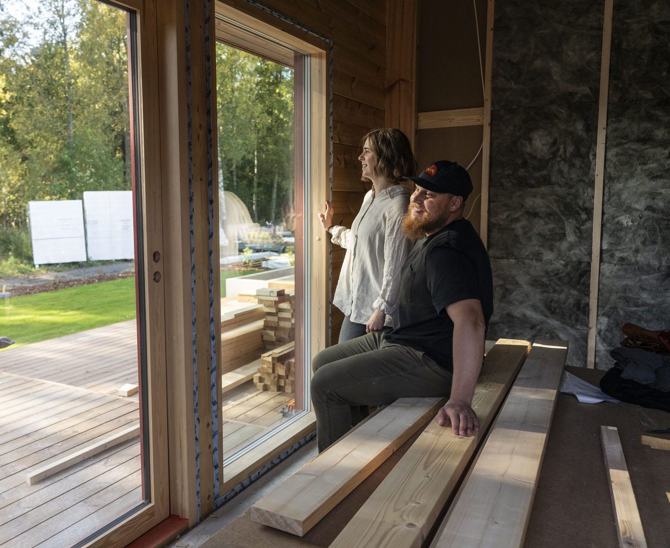 Ensirakentajina Emma ja Lassi ovat sukeltaneet suoraan rakennuttamisen syvään päätyyn. – Tontteja kaavoitetaan harvoin näin kivalle paikalle. Se herätti ajatuksen oman talon rakentamisesta ja messuille osallistumisesta, Lassi kertoo. – Minusta tämäkin on vähän huvittava juttu, että mehän vain kokeilimme kepillä jäätä, saammeko me täältä tonttia, Emma kertoo. Tontti heltisi ja arkkitehti Juho Lonkila suunnitteli ystävilleen yksilöllisen kodin, jota Lassi kuvailee koskettavasti pariskunnan näköiseksi persoonien kuvajaiseksi.