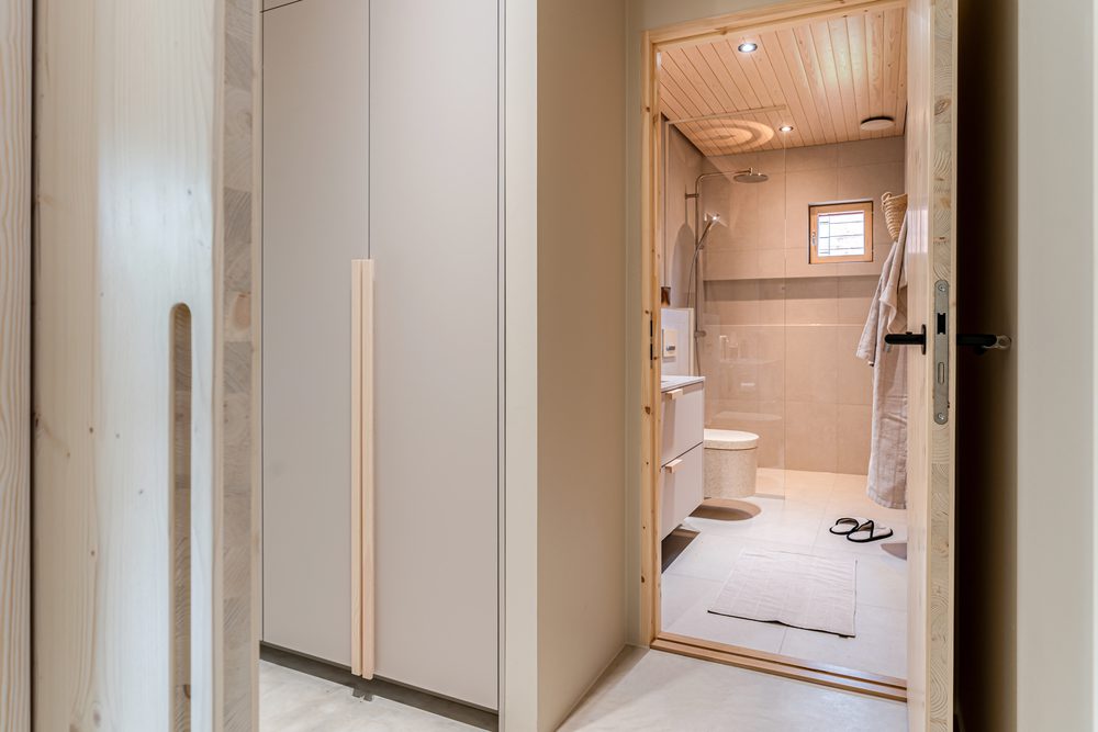 Materiaalien määrä on pidetty sisustuksessa tarkoituksellisen niukkana. Mäntyä on käytetty ulkoseinien lisäksi myös kiintokalusteissa. – Halusimme, että mänty ja luonnollisuus jatkuvat myös sisällä ja materiaalit ovat oikeasti sitä, miltä ne näyttävät, Emma toteaa. Asuintilojen hierretty betonilattia korostaa hienosti puun lämpöä. Tilojen värimaailmat vaihtuvat käyttötarkoituksen mukaan makuuhuoneiden pehmeistä sävyistä, oleskelutilojen vaaleaan ja taas saunaosaston vahvoihin lämpömännyn ja terrakotan sävyihin.