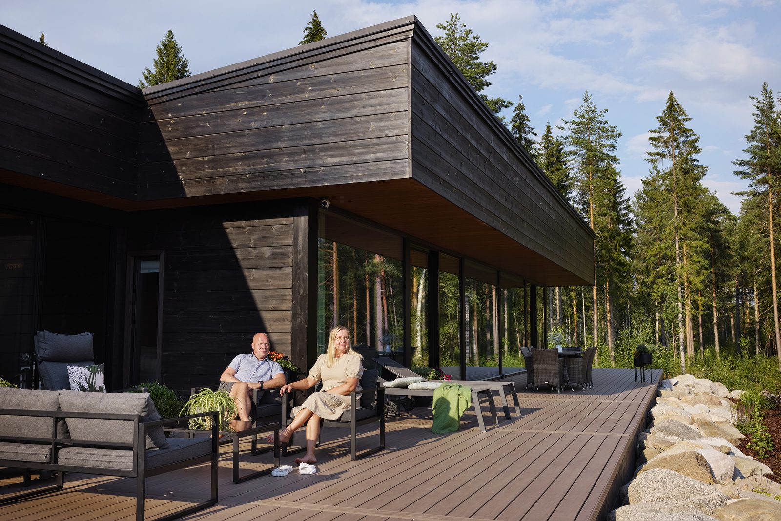 Katjalla ja Artolla oli pitkä toivelista unelmien vapaa-ajanpaikasta: alle sata kilometriä kotipihasta, hehtaarin kokoinen katseilta suojassa oleva tontti, etelän puoleinen ranta ja kunnallistekniikka pitää ainakin olla. Kun kaikki tämä löytyi avarilla maisemilla Keurusselän rannalta, Katjan ja Arto päättivät melkein lennosta, että tähän se tulee: meidän mökki. Yllättävän pian tontilla seisoi lähes kokonaan itse tehty Hongan Lux 145 -hirsihuvila.