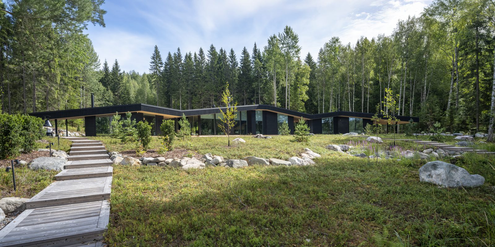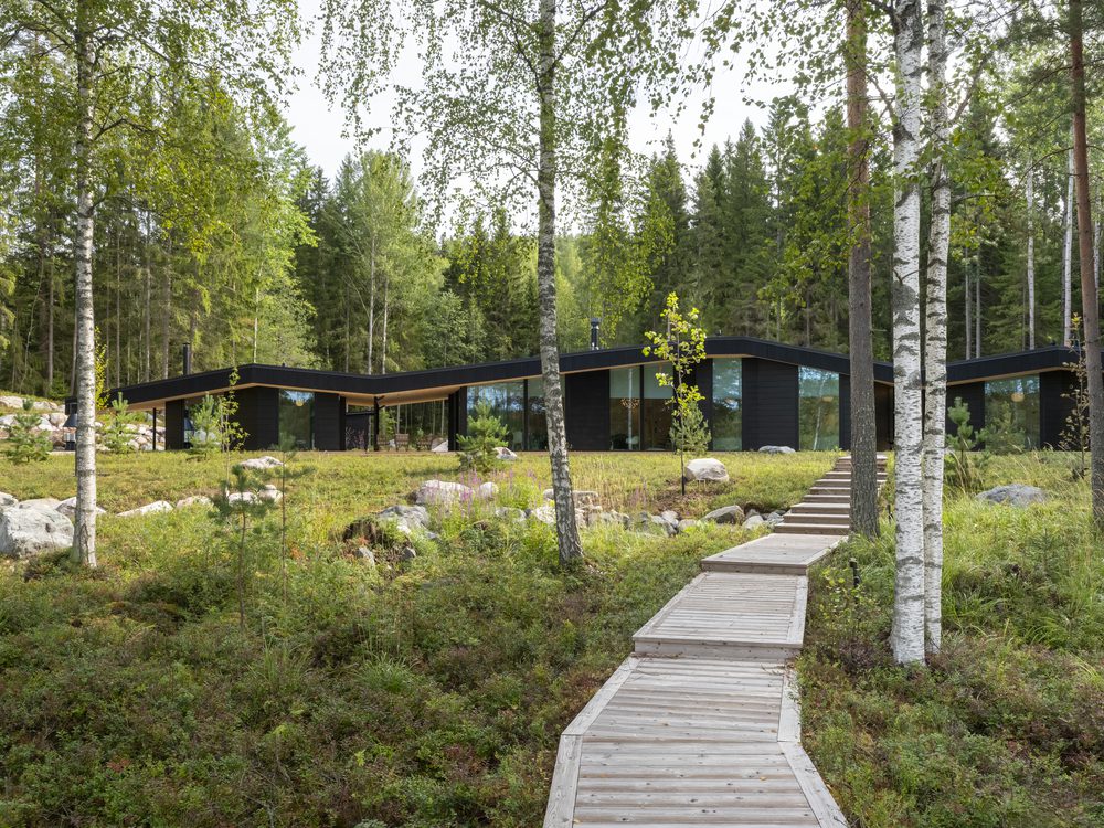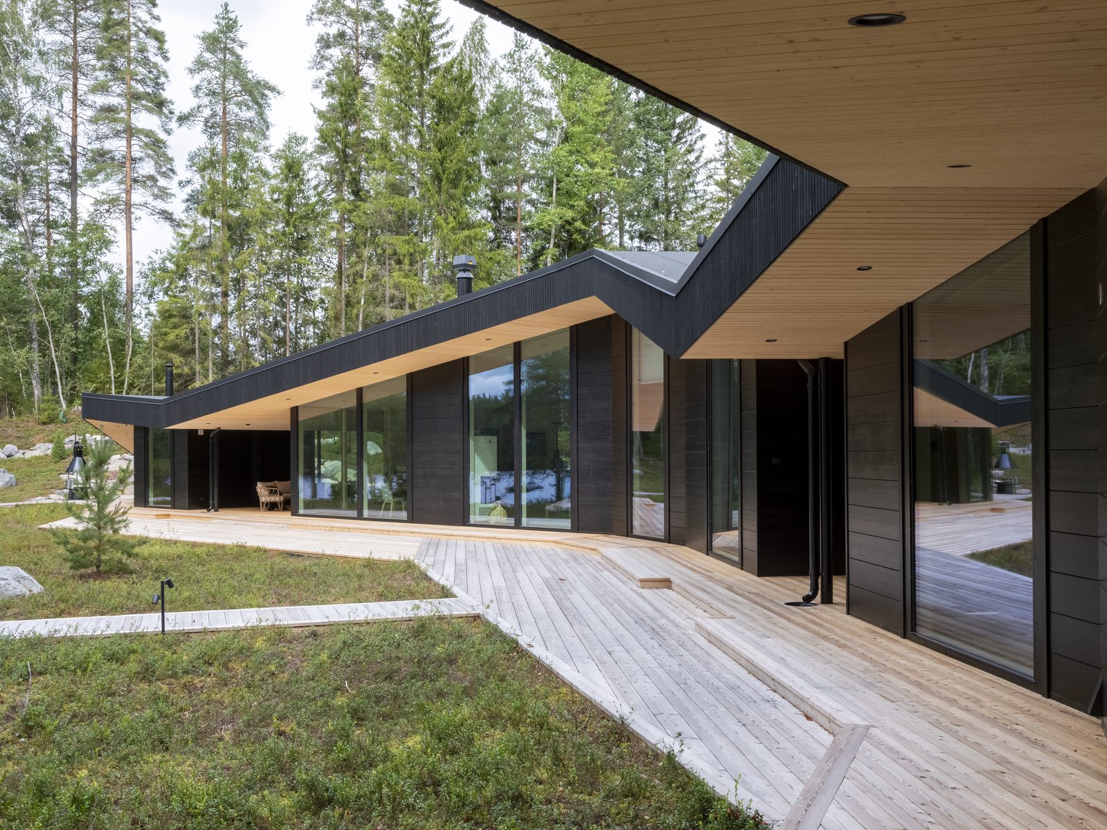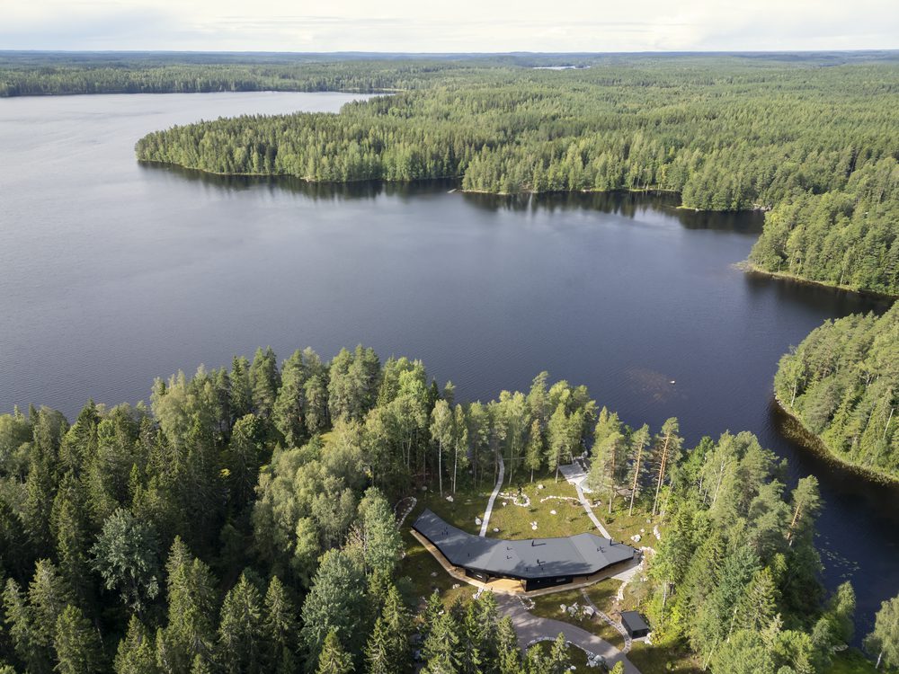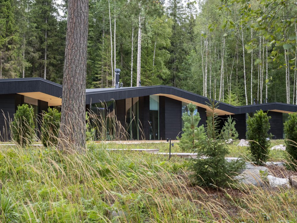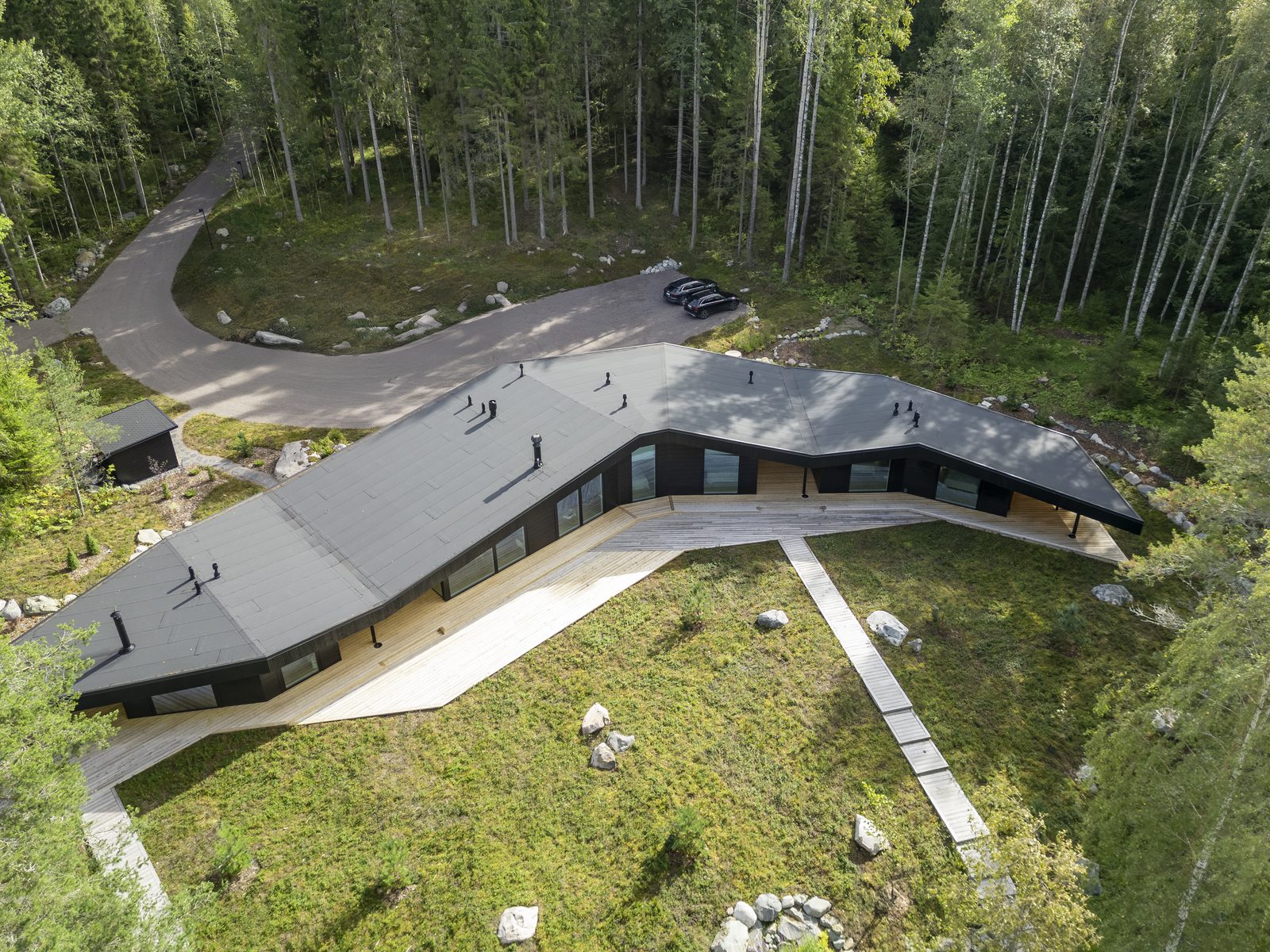 Kekseliäs rakennus seuraa ympäristön muotoja – katon aaltoileva linja mukailee rinteitä ja tumma, läpikuultava pintakäsittely viimeistelee kokonaisuuden. Huonekorkeus nousee parhaimmillaan 4,5 metriin, ja suuret maisemaikkunat avaavat upeita näkymiä järvelle ja metsään.