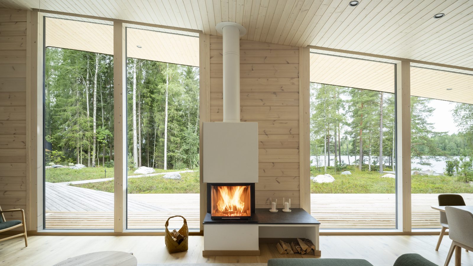 Sisätiloissa jatkuu sama luonnonläheinen linja. Materiaalivalinnoissa on suosittu puuta ja kiveä, jotta rauhallinen tunnelma säilyy ja maisemaikkunoiden näkymät pääsevät oikeuksiinsa.