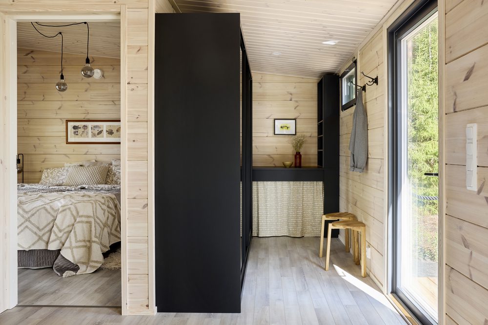 – Minä toivoin yksitasoista ratkaisua ja haaveilin siitä, että näkisimme sisältä sekä auringonnousun että -laskun ja voisimme ihailla kapeaa saarta ympäröivää järveä isoista ikkunoista. Kaipasin myös tarpeeksi säilytystilaa. Tässä 65 neliössä toteutuvat kaikki toiveet, Meini sanoo.