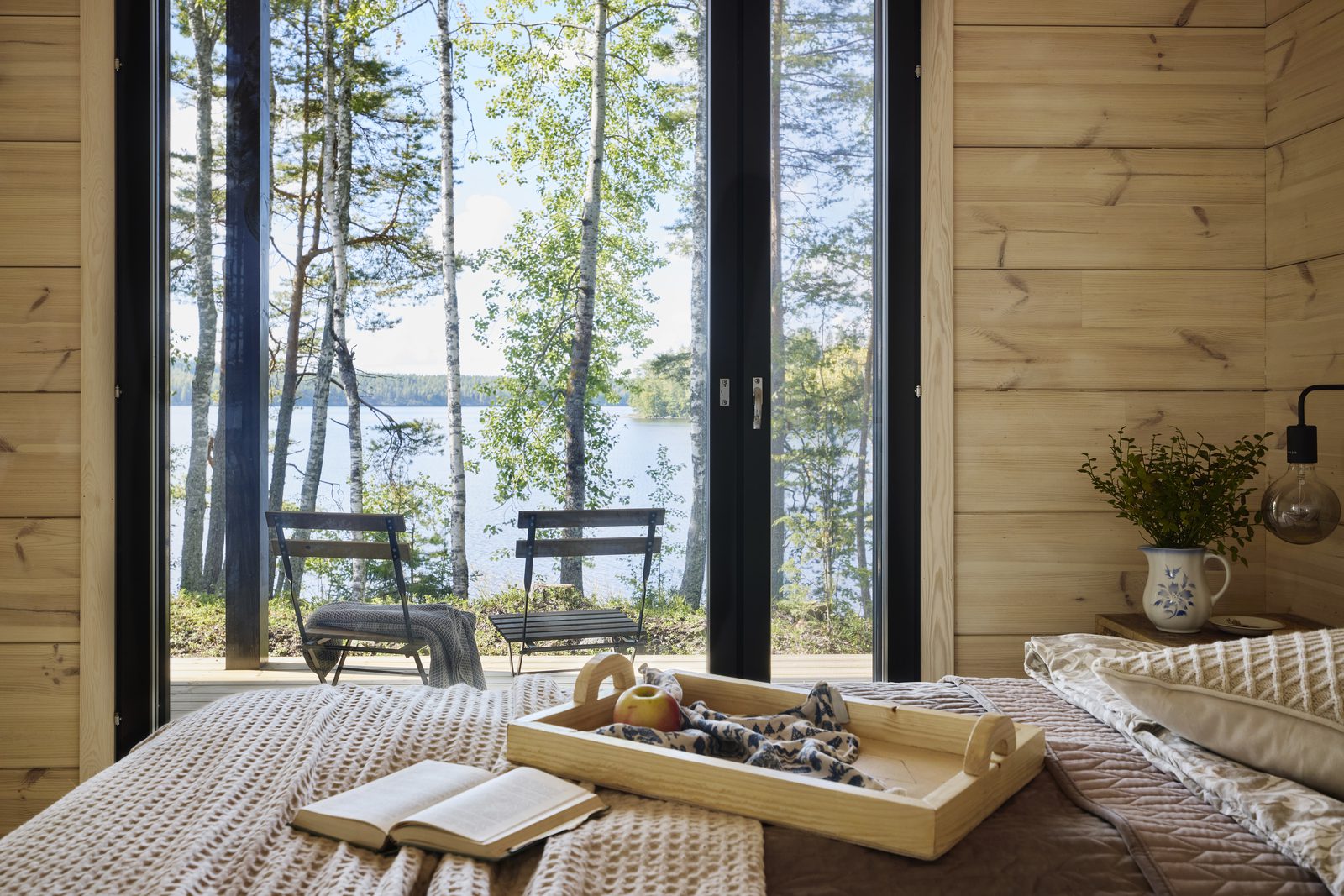 Minä toivoin yksitasoista ratkaisua ja haaveilin siitä, että näkisimme sisältä sekä auringonnousun että -laskun ja voisimme ihailla kapeaa saarta ympäröivää järveä isoista ikkunoista. Kaipasin myös tarpeeksi säilytystilaa. Tässä 65 neliössä toteutuvat kaikki toiveet.