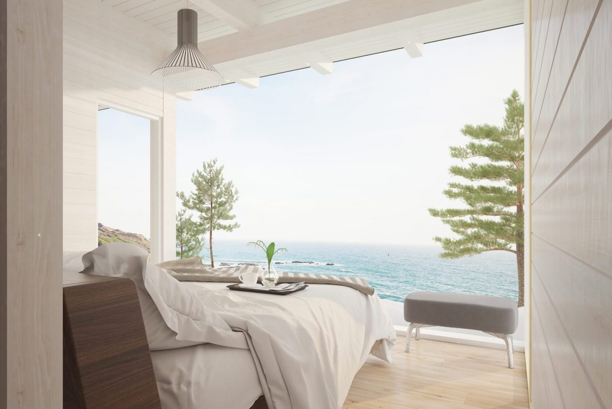 Tyven-lomakoti piiloutuu maisemaan, mutta yllättää intensiivisyydellään. Suuret maisemaikkunat päästävät maiseman ja valon sisätiloihin.